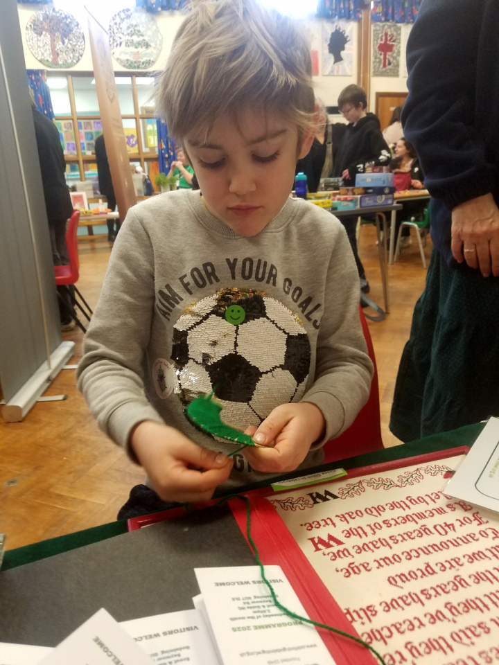 Ockford - Godalming WI took part in the Community Day on Tuesday at St Marks & All Saints Primary School. We were there to promote our WI, by displaying some of our facinating archives from 1948 which visitors loved reading. We had various craft activities available such as working with wool and ribbon weaving. This patient young man made a wool pompom.