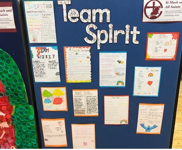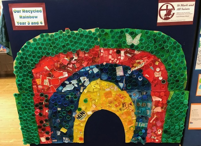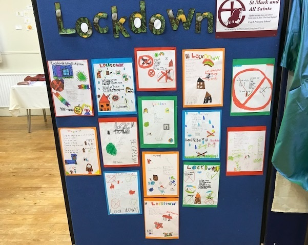 Our local school, St Mark & All Saints Church of England School put on this lovely dislay of their work. Pictured above, Decorated pebbles on the left and a beautiful rainbow made of recycled materials on the right. Below are displays of creative writing about "Lockdown", which were very interesting but also very poignant to read.