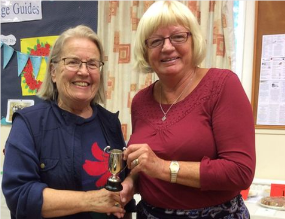 Monica Bowen won the cup for the highest number of points at the Flower and Produce Show. The photograph shows Monica receiving her cup from the Federation Chairman.